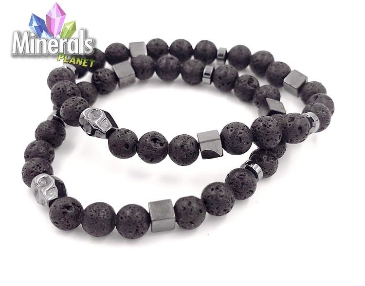 Bransoletka gładka z naturalnej lawy wulkanicznej z hematytami.